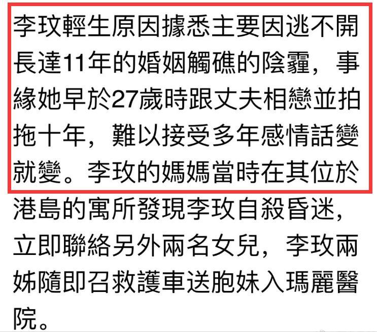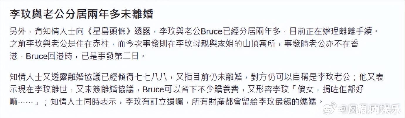 知情东谈主称,李玟与老公Bruce依然分居两年多,当前正在办理仳离手续。之前李玟与老公是住在赤柱,婚变后搬到了母亲与家姐的山顶寓所,李玟归天时老公照实不在香港,回港时已是事发第二日。