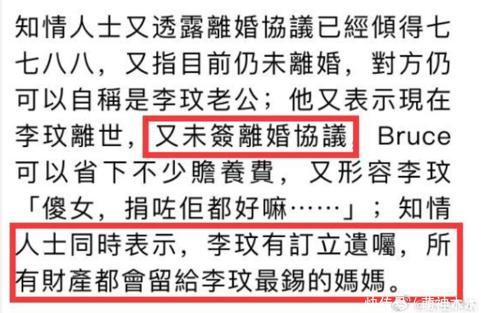 随后,知情东谈主士也清晰两东谈主蓝本仳离合同订立行将完成,但莫得绝对完成手续,对方仍不错自称是李玟老公,该知情东谈主也无奈示意,当前李玟离世,又未签仳离合同,Bruce不错省下不少抚养费。
