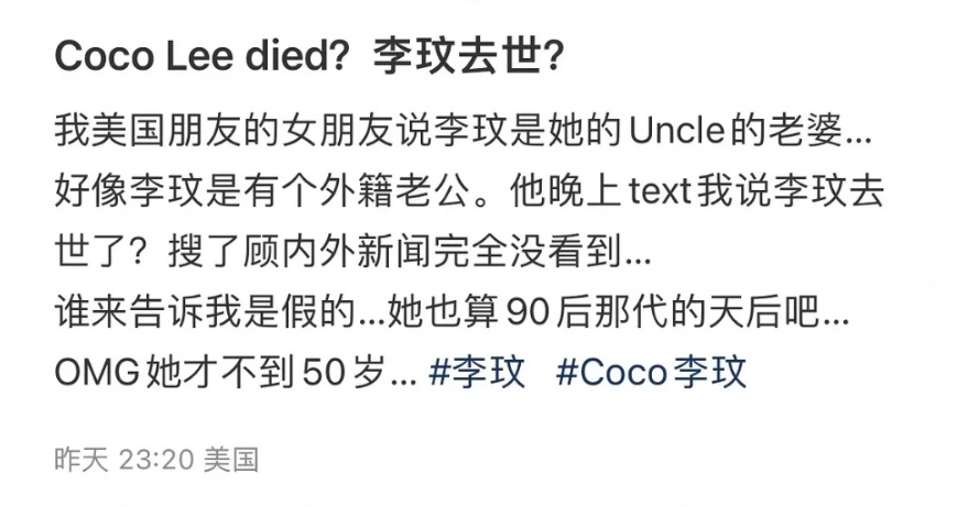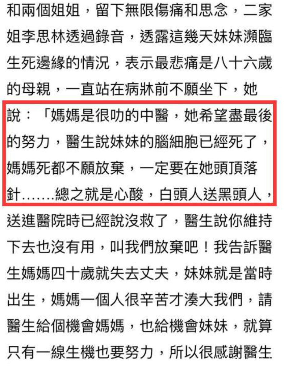 李玟的离世过于片刻,包括家东谈主也于今不肯意信服。