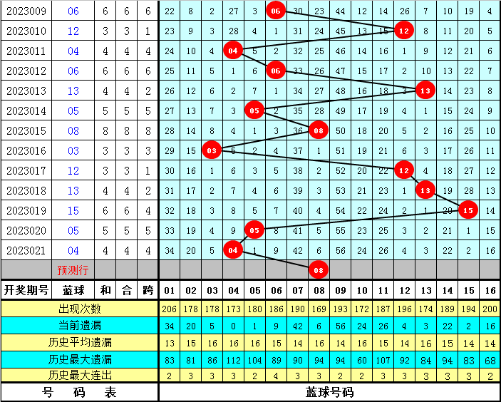 上期蓝球号码为04,为中尾蓝球,最近10期出现了1个小尾蓝球,8个中尾蓝球,1个大尾蓝球,大尾蓝球认知较冷,刻下走冷6期,本期缜密大尾蓝球解封,暖和蓝球08。