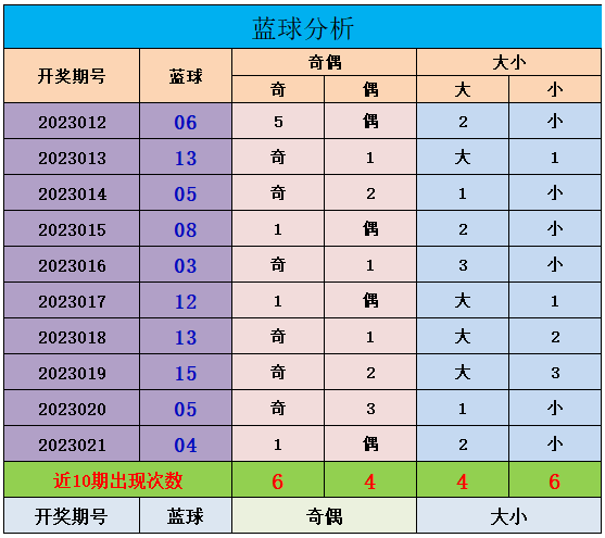蓝球分析:上期蓝球开出小偶数号码04,近10期奇偶比为6:4,奇数走势稍热,本期蓝球温雅偶数开出;最近10期蓝球大小比4:6,上期开出小号蓝球,本期温雅极少开出,本期蓝球参考:01